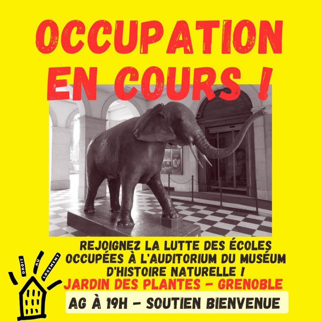 Depuis 17h, la coordination des écoles occupées et les familles de l’école Jean Macé occupent avec les familles sans-logis l’auditorium du Muséum d’histoire naturelle (jardin des plantes, Grenoble). Nous occupons dès ce soir, pour une durée indéterminée, jusqu’à satisfaction de nos revendications :
